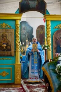 Батюшка подчеркнул особое покровительство Пресвятой Владычицы нашей Богородицы над нашим народом и отметил, что Пресвятая Дева Мария Своей чистотой и святостью превзошла не только всех людей, но и ангелов, увенчавшись славою, «славнейшая Серафим» и честью, «честнейшая Херувим». И величия Она достигла еще до того, как родила Сына Божия, став «Небесной Дверью, вводящей Христа во Вселенную во спасение душ наших».